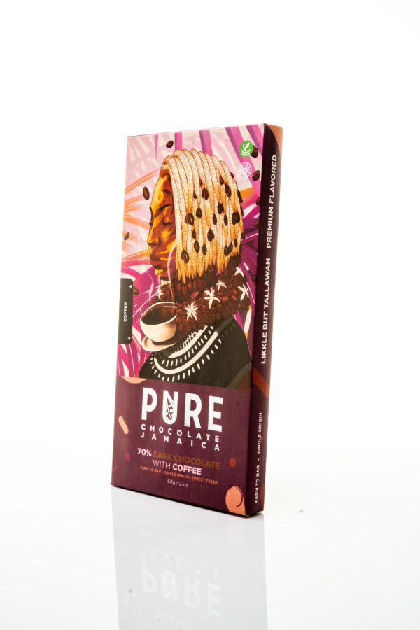 Der Blue Mountain Coffee aus Jamaika gilt als einer der edelsten Kaffees der Welt. Seine Ausgewogenheit zwischen fruchtiger Süße und würziger Säure und seine Geschmacksnuancen von Nougat und Karamell harmonieren wunderbar mit den Kakaobohnen, so dass Pure Chocolate nicht lange überlegen musste! Kein Wunder, dass sie zu einer ihrer beliebtesten Tafeln geworden ist.