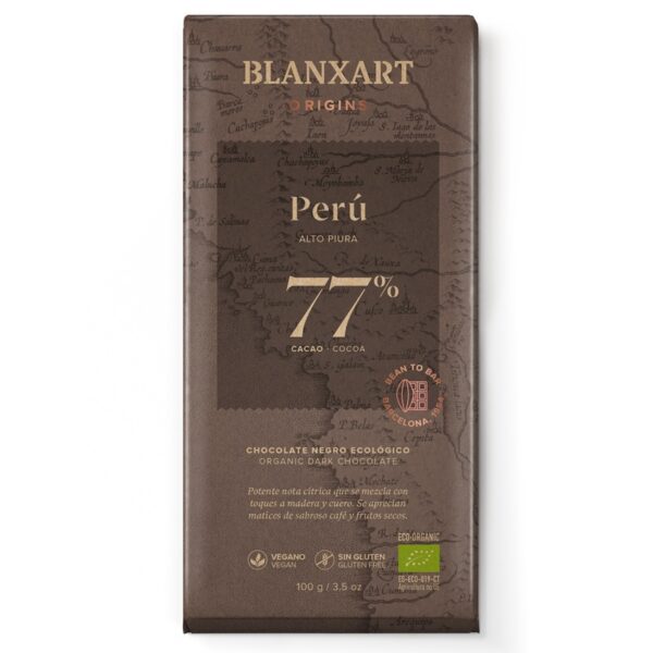 This 77% organic dark chocolate is made from hand-selected cocoa beans of the Criollo variety originating from the Alto Piura region of Peru. A beautifully rounded chocolate with notes of citrus and red fruits and Brazil nuts.