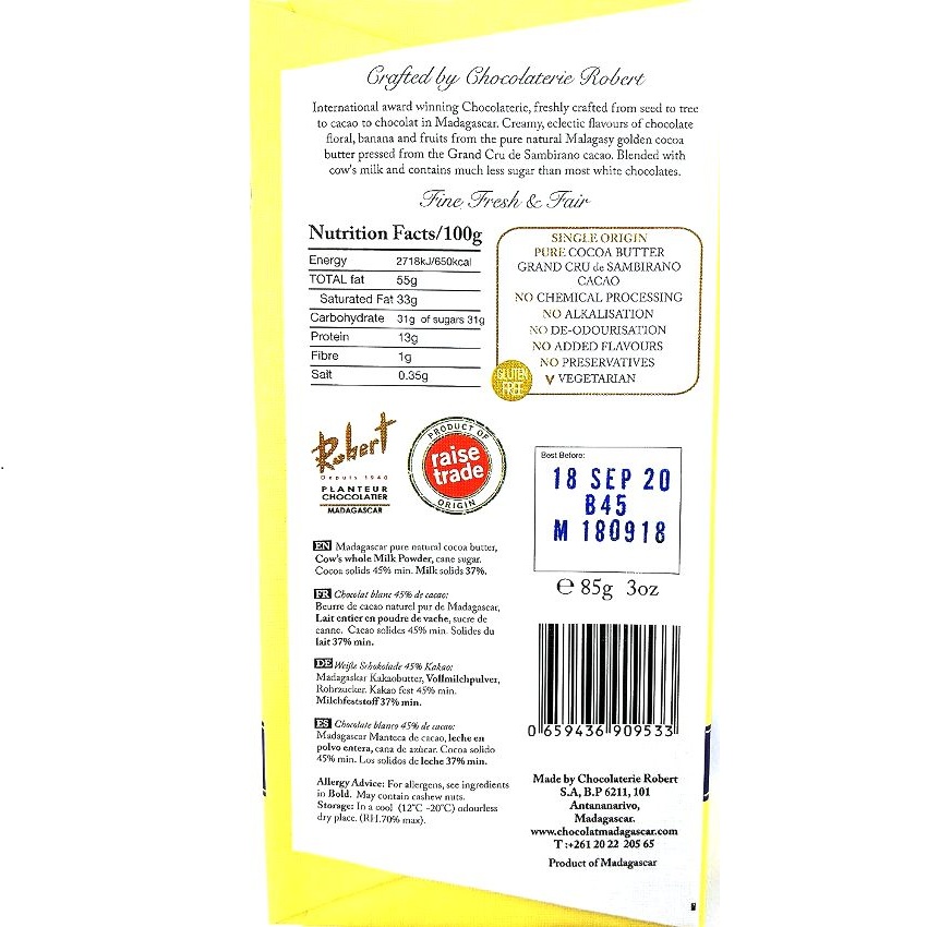 Madagaskische witte chocolade (45% cacaogehalte) gemaakt van Grand Cru de Sambirano-cacaobonen en volle melk. Dit resulteert in een witgouden chocolade met een romige, milde smaak.
